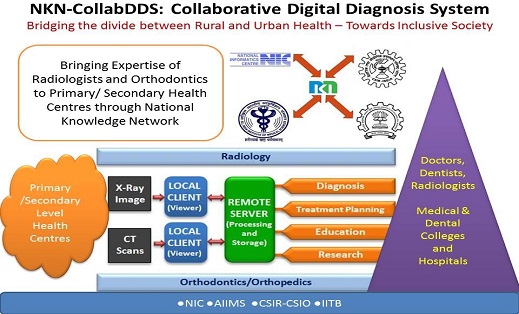 The project has been envisaged and is in progress keeping in view two goals. First one is to connect Primary Health Centres (PHC’s) with expert radiologists/ doctors & dentists at Medical/ Dental colleges and Hospitals using suitable Information, Communication and Technology (ICT) tools and channel for real time radiological data transmission. This platform would enable physicians at remote level PHC’s to have real time radiological diagnosis for their patients. Further, experts could use this platform to collaborate. The high-bandwidth and low-latency capability of the NKN would provide an ideal platform for data transmission as radiological data is huge in size and thus poses problems for utilization in real time because of latency in data transmission. This would prove to be of extreme value for both patients and primary level physicians in rural areas for radiological consultation with experts sitting at tertiary centres in real time and thus provide better diagnoses and treatment.